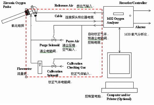 氧化锆探头与氧气分析仪连接和自动或手动校正,清尘示意图